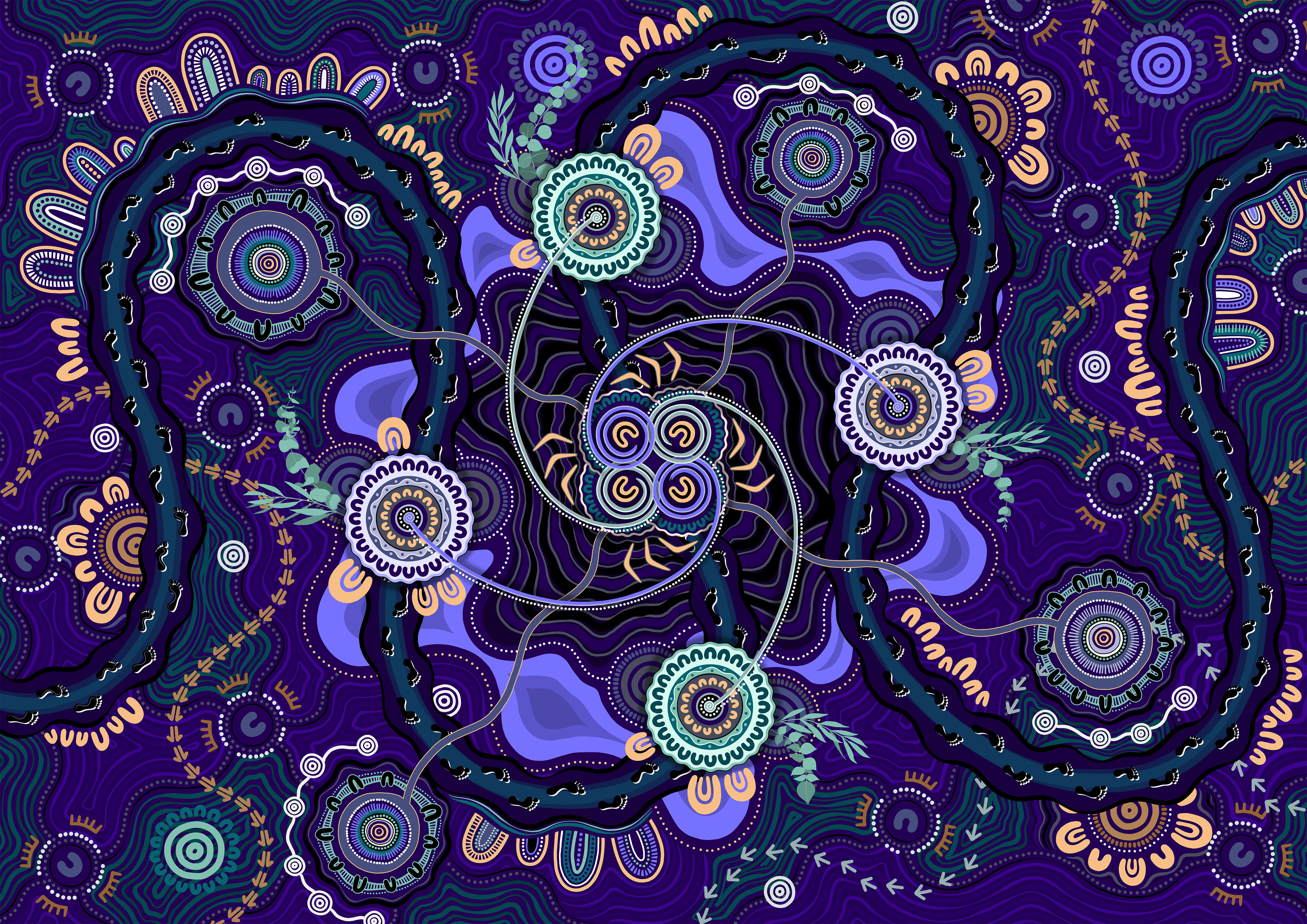 The next layer expresses reconciliation as a living practice. It honours the knowledge, histories and cultures of First Nations peoples, recognising the interconnectedness of people and Country. It speaks to the shared responsibility of preserving culture, speaking truth and honouring the ancient wisdom that has echoed for over 65,000 years. Reconciliation is shown not as symbolism, but as action - a shared commitment to change.